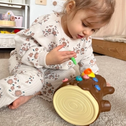 Das Spiel ist für zwei Kinder gleichzeitig konzipiert, sodass sie auch Zusammenarbeit und gesundes Wettstreiten lernen. Bunte Elemente und das Angeln der Würmchen aus den Öffnungen im „Stamm“ fördern visuelle Wahrnehmung und logisches Denken.