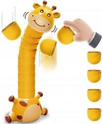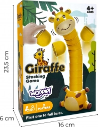 Spielregeln: Die Spieler wechseln sich ab und stapeln die Teile, um den höchsten Turm in Form eines Giraffenhalses zu bauen. Das Glücksrad bestimmt, wie viele Teile hinzugefügt werden müssen. Das Spiel endet, wenn ein Spieler die Giraffe umwirft.