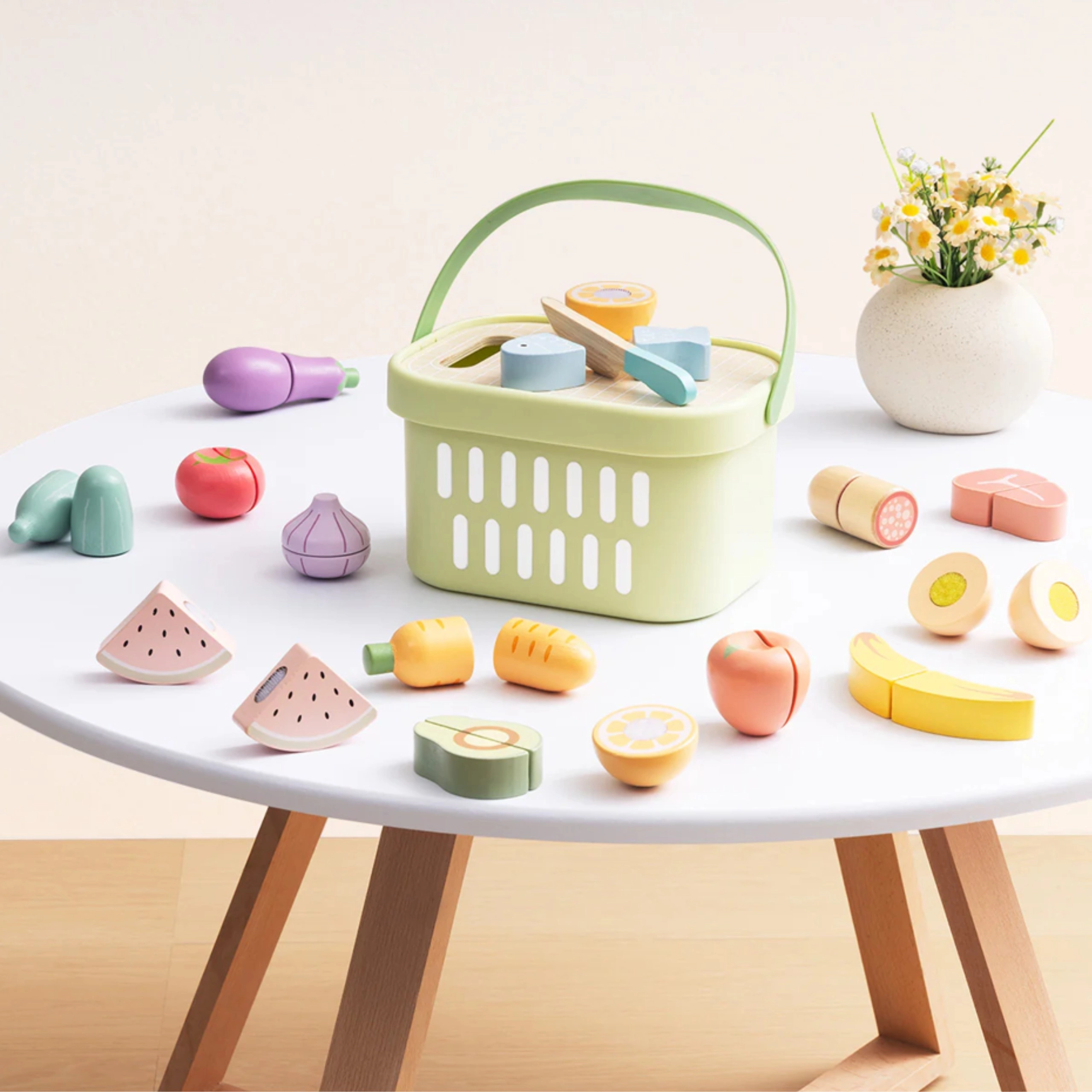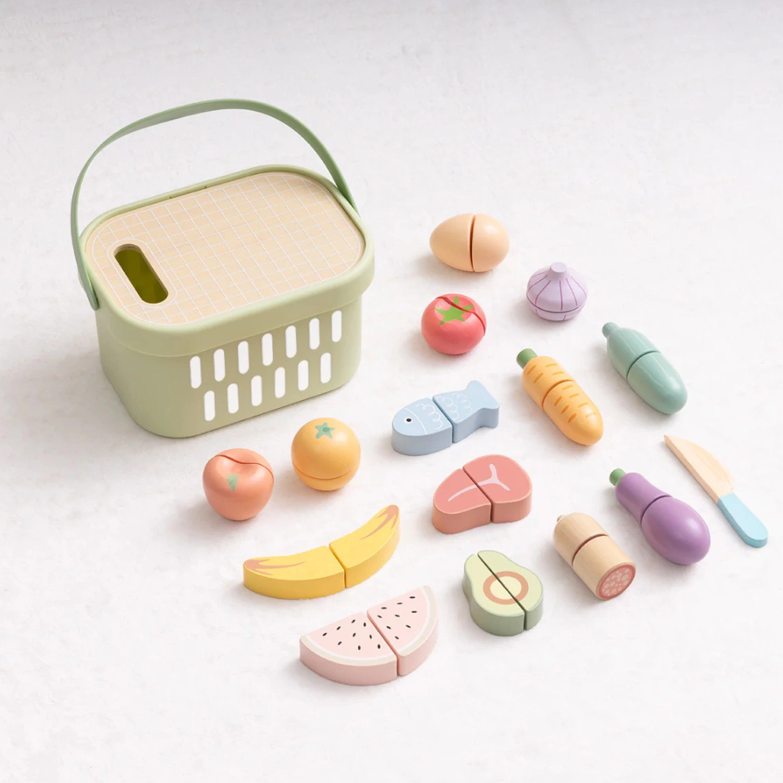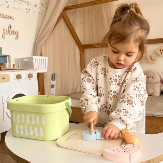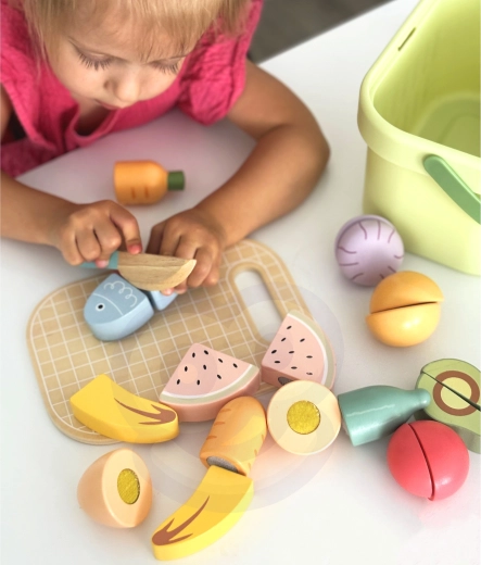 Das Holz-Lebensmittelset von TOOKY TOY ist ideal für die kleine Spielküche. Pastellfarbenes Obst und Gemüse, Fisch, Steak, Käse oder Ei sind in Teile geteilt und mit Klett verbunden – Kinder können sie mit dem Holzmesser auf dem beiliegenden Brett sicher „schneiden“ und wieder zusammenfügen. Alles kommt in den leichten Korb, so ist das Set einfach zu transportieren und stets ordentlich verstaut.