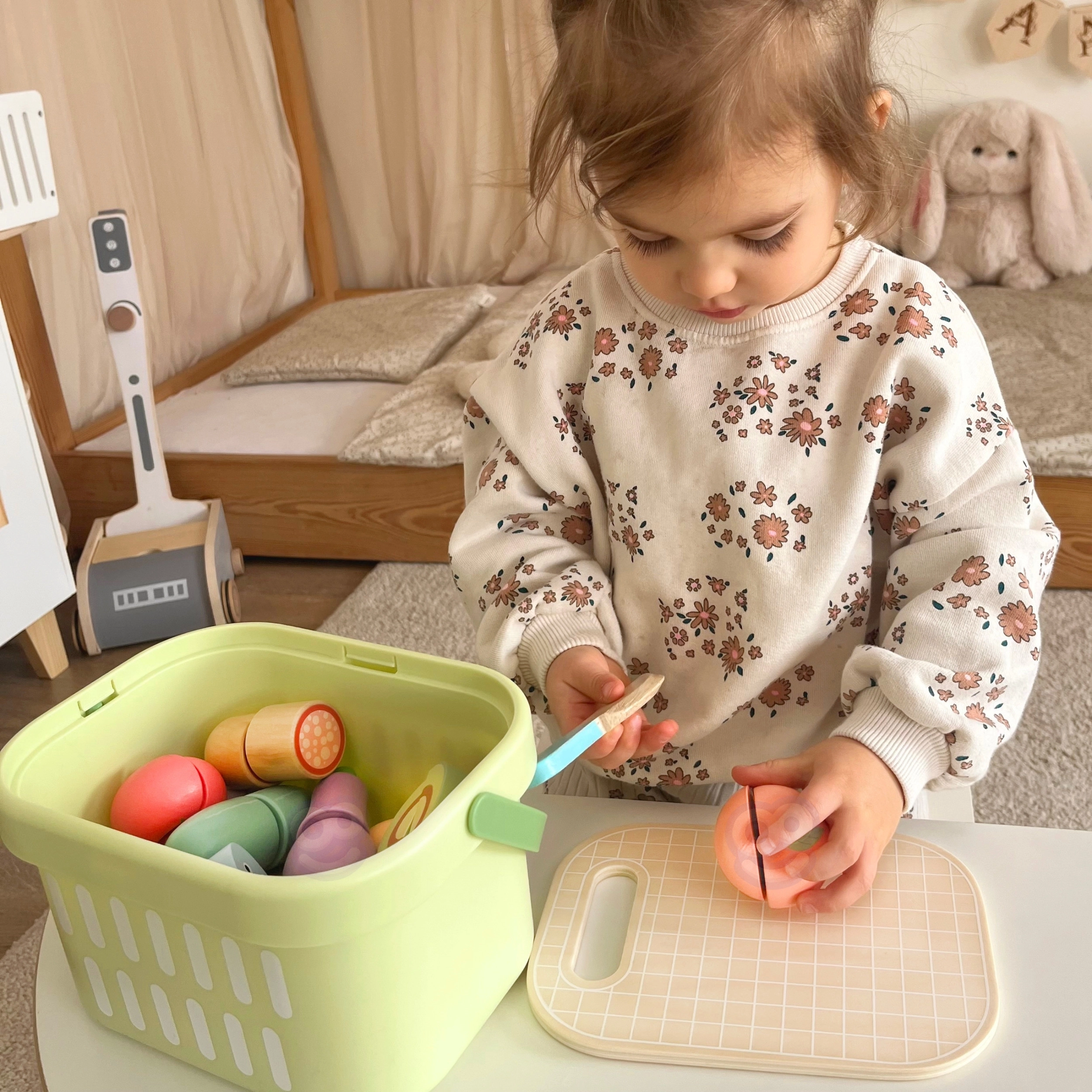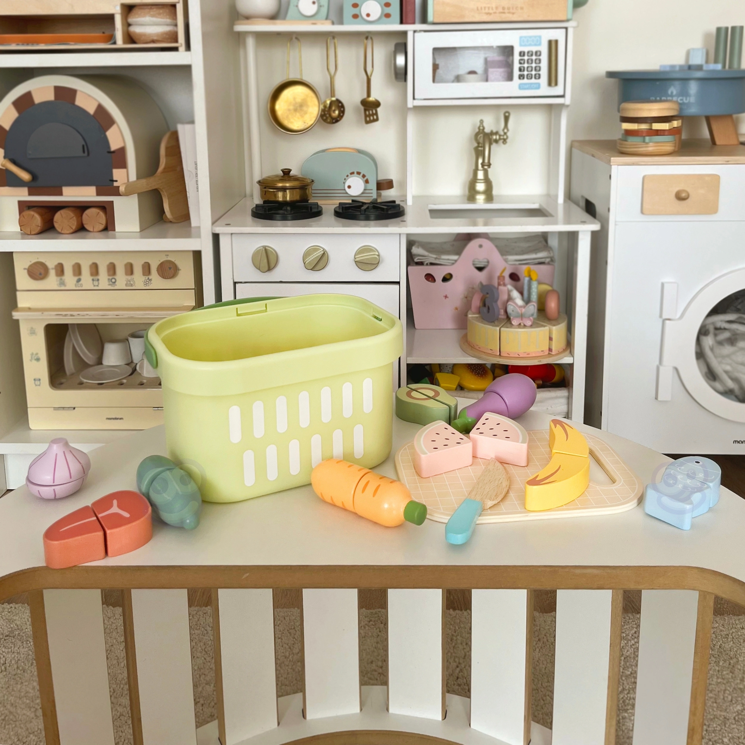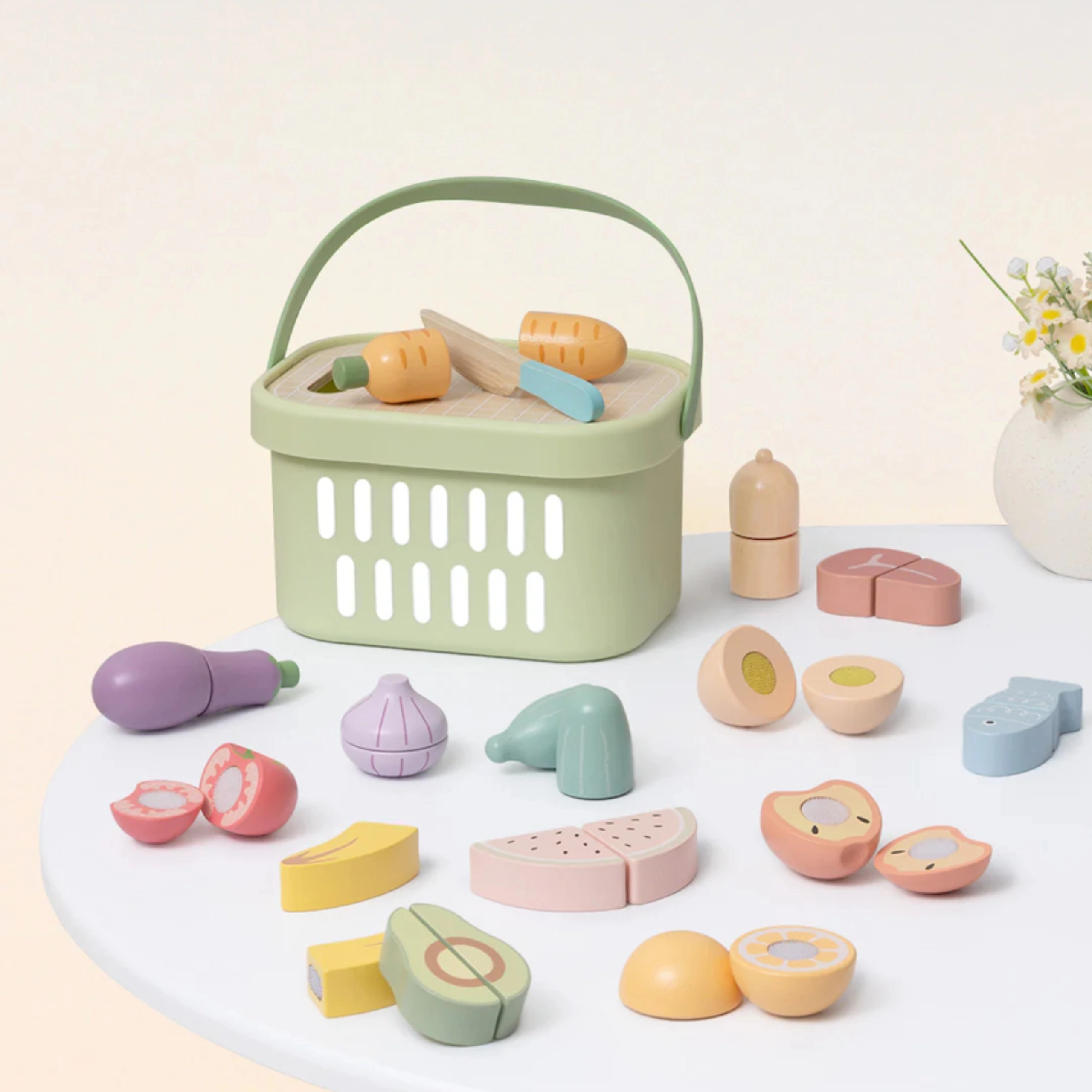 Das Holz-Lebensmittelset von TOOKY TOY ist ideal für die kleine Spielküche. Pastellfarbenes Obst und Gemüse, Fisch, Steak, Käse oder Ei sind in Teile geteilt und mit Klett verbunden – Kinder können sie mit dem Holzmesser auf dem beiliegenden Brett sicher „schneiden“ und wieder zusammenfügen. Alles kommt in den leichten Korb, so ist das Set einfach zu transportieren und stets ordentlich verstaut.