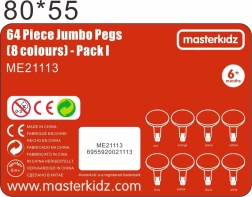 Das Set enthält 64 Jumbo-Steckstifte – 8 pro Farbe. Ideal zum Erlernen von Farben, zum Sortieren und zum Gestalten auffälliger Muster. Geeignet für Kinder ab 6 Monaten.