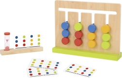 Dieses Lernspiel bringt Kindern Freude am Entdecken und trainiert die Konzentration. Die Aufgabe besteht darin, bunte Scheiben entsprechend der gewählten Karte in die richtige Reihenfolge zu bringen – und das innerhalb der Zeit, die die Sanduhr misst. Die Ausführung aus Holz liegt gut in der Hand, die Oberfläche ist mit ungiftigen Farben versehen.
