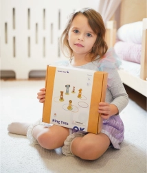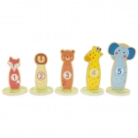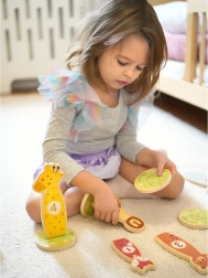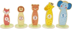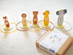 Dieses Holz-Wurfspiel mit lieben Tieren (Fuchs, Bär, Löwe, Giraffe und Elefant) lehrt Kinder, Ziele zu treffen, und fördert Feinmotorik sowie Konzentration. Jede Zielscheibe hat eine Zahl – so lernt das Kind ganz natürlich Punkte zu zählen und weitere Würfe zu planen. Die Teile können beliebig aufgestellt werden, sodass sich die Schwierigkeit leicht variieren lässt.