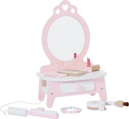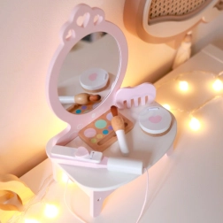 Diese wunderschöne Kindertoilette in Rosa ist mit einem Spiegel und 11 verschiedenen Accessoires ausgestattet, darunter Kamm, Lippenstift, Haarglätter, Puderquaste und weitere. Alle Accessoires sind aus hochwertigem Holz gefertigt und ihr Design in Pastelltönen verleiht dem Spielzeug ein zauberhaftes Aussehen. Die Toilette bietet ausreichend Stauraum für alle geheimen kosmetischen Tricks Ihres kleinen Models.