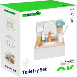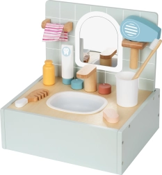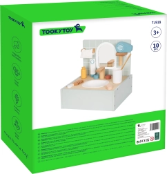 Verwandeln Sie alltägliche Hygienerituale in kreativen Spaß mit dem Holz-Badezimmer von Tooky Toy. Dieses niedliche Mini-Set enthält alles, was Sie für das Spielen von Badeszenen brauchen, einschließlich eines Spiegels, eines falschen Waschbeckens mit Wasserhahn und realistischer Accessoires.