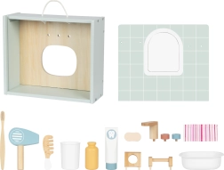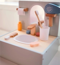 Das Holz-Badezimmer von Tooky Toy ist ideal für Kinder ab 3 Jahren. Es enthält verschiedene Bade-Accessoires, die darauf abzielen, Kinder zu wichtigen Hygieneritualen zu motivieren. Das Set beinhaltet: