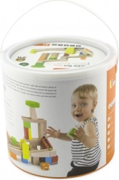 Zum Lieferumfang gehört ein praktischer Eimer mit Henkel für bequemes Verstauen und Transportieren. Die Teile bestehen aus hochwertig lackiertem Holz und sind mit ungiftigen Farben in kräftigen Tönen eingefärbt. Das Spielzeug fördert Feinmotorik, räumliches Vorstellungsvermögen, logisches Denken und unterstützt die Kreativität.