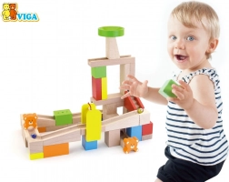 Diese Holz-Kugelbahn der Marke VIGA bietet Kindern stundenlangen Spielspaß und Lernen. Aus vielfältigen Bausteinen, Rampen, Säulen und einem Trichter lassen sich mühelos unzählige Strecken bauen, auf denen die Kugeln flüssig rollen. Das Set enthält auch dekorative und verspielte Elemente wie Stufen und Bären, die den Bauten Charakter verleihen und das Erzählen von Geschichten fördern.