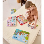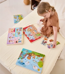 Die Puzzles zeigen bunte Tierfiguren, die verschiedene Musikinstrumente spielen.