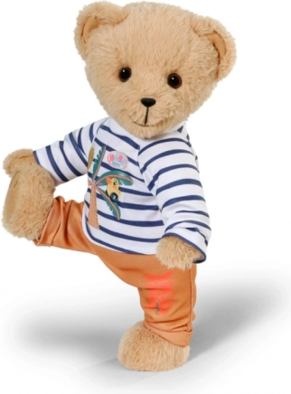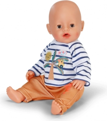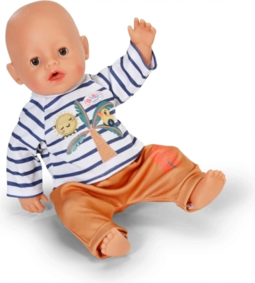 Stylisches Set für BABY born Puppen und den BABY born Teddy besticht durch Komfort und verspieltes Design. Es enthält ein langärmliges, gestreiftes Shirt mit Palmen- und Sonnenmotiv sowie eine orangefarbene Hose mit Print. Das Outfit ist für Puppen mit 43 cm geeignet und lässt sich dank weicher Materialien leicht an- und ausziehen. Inklusive Kleiderbügel aus recyceltem Material. Ideal für kreatives Spielen, leichtes Umziehen und langanhaltenden Spaß.