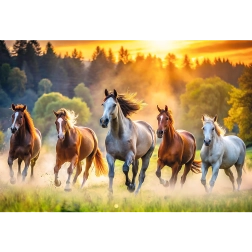 Das Motiv der galoppierenden Pferde auf einer grünen Wiese begeistert Natur- und Tierliebhaber und wird zum schönen Blickfang in Ihrem Interieur.