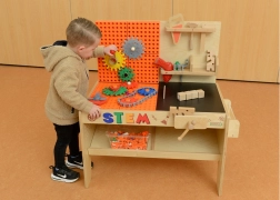 Die Werkbank ist mit einer Vielzahl von STEM-Zubehörteilen kompatibel (Zahnräder, Räder, Rollen, Schrauben, Stifte u. a.), sodass sich Aktivitäten leicht vom einfachen Schrauben bis zu komplexen Getrieben und Bahnen erweitern lassen. Ideal für das Zuhause, den Kindergarten und Spielecken – überall dort, wo Neugier und technisches Denken gefördert werden sollen.