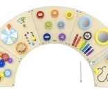 Diese hochwertig verarbeitete Wandtafel in Halbkreisform eröffnet Kindern eine bunte Welt des Entdeckens: Zahnräder, Labyrinth, Perlenbahn, Formenzuordnung, Musikelemente (Xylophon, Gong), Spiegel, „Wetter“ und „Jahreszeiten“, Drehscheibe sowie Thermometer. Durch die robuste Wandmontage spart sie Platz und fördert Hand-Auge-Koordination, Farben- und Formerkennung sowie logisches Denken.