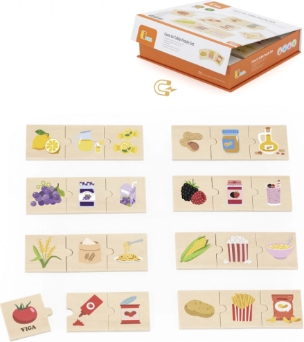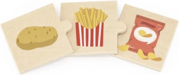Dieses hochwertige Holz-Set präsentiert einfache Zuordnungspuzzles, die den Rohstoff mit dem verarbeiteten Produkt verbinden. Kinder lernen spielerisch, wo ihre Lieblingssnacks herkommen – zum Beispiel Kartoffel und Pommes, Zitrone und Limonade, Mais und Popcorn oder Trauben und Traubenmarmelade/Saft.