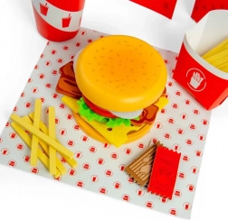 • 48 Teile, darunter Brötchen, Beläge, Pommes, Getränk, Mitnahmebox, Servietten, Menü und Gewürze.