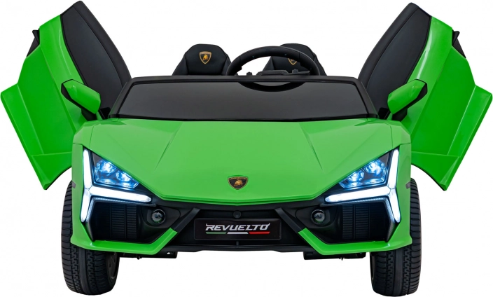 Luxuriöses elektrisches Kinderauto LAMBORGHINI REVUELTO XL in Grün begeistert mit realistischem Look, aufklappbaren Lambo-Türen, starkem Allradantrieb 4x200 W und 24 V / 7 Ah Batterie. Zwei Sitze aus Ökoleder mit Sicherheitsgurten, LED-Scheinwerfer vorne und hinten sowie ein Audio-Panel mit FM, Bluetooth, USB und MP3 machen jede Fahrt zum Spaß – gesteuert vom Kind oder per elterlicher 2,4-GHz-Fernbedienung mit Stop-Taste.