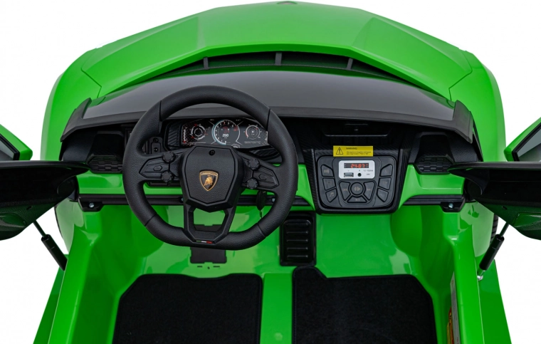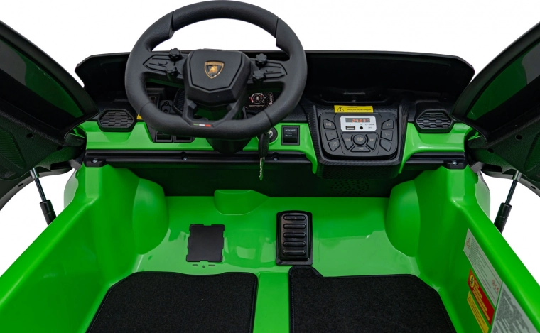 Der Innenraum überzeugt mit Doppelsitz aus Ökoleder mit Gurten und umfangreicher Multimedia-Ausstattung: FM-Radio, Bluetooth, USB, AUX und MP3-Wiedergabe plus vorinstallierte Melodien. LED-Lichter vorne und hinten, sportliche Details und Scissor Doors unterstreichen den authentischen LAMBORGHINI-Look. Eltern schätzen die 2,4-GHz-Fernbedienung mit 3 Geschwindigkeiten und Sicherheits-Stopptaste.