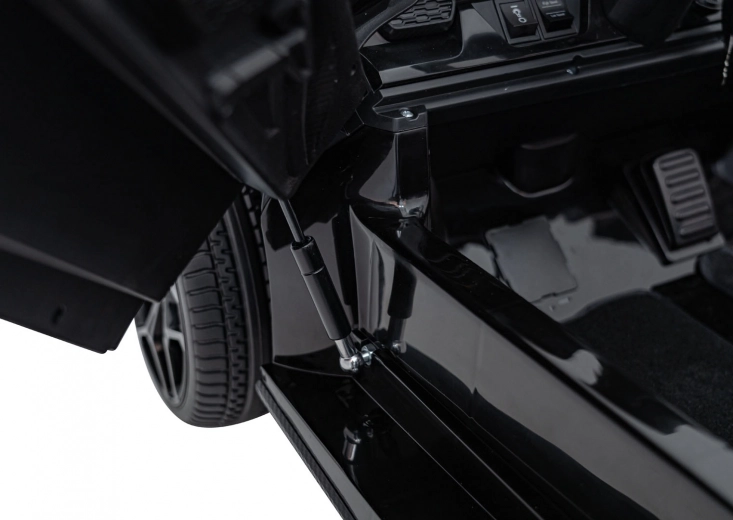 Eltern schätzen die fortschrittlichen Sicherheitsmerkmale: 2,4-GHz-Fernsteuerung mit 3 Geschwindigkeiten, sanftem Start, Sicherheits-Not-Stopp und Sicherheitsgurten. Kinder freuen sich über öffnende Scherentüren, LED-Beleuchtung vorne und hinten sowie Multimedia: FM-Radio, MP3, USB, AUX, Bluetooth, Sounds und Hupe am Lenkrad. Praktisch sind zudem Ladezustandsanzeige und hinterer „Kofferraum“.