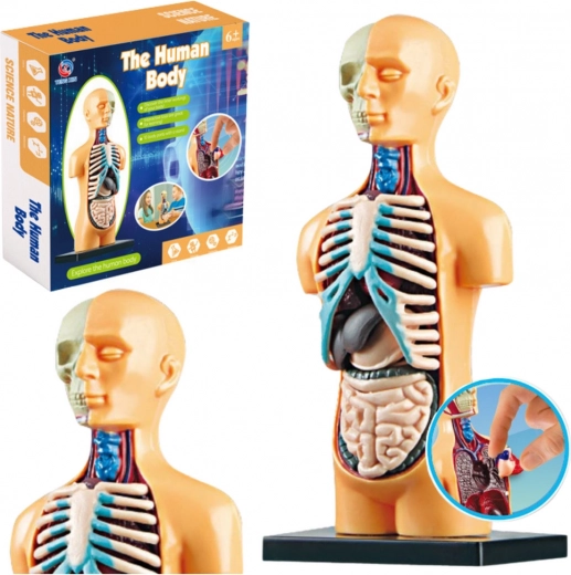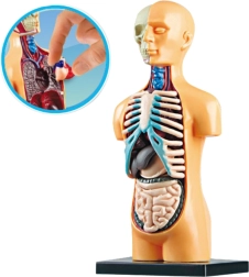 Das Modell des menschlichen Körpers ermöglicht es Kindern, die Anatomie des Menschen durch die detaillierte Darstellung von Organen wie Herz, Lunge oder Leber zu verstehen. Kinder können die Organe entnehmen und wieder einsetzen, was das Merken ihrer Position und Funktionen erleichtert.