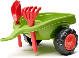 Transportiert Spielzeug, Sand oder kleine Lasten. Der Anhänger lässt sich leicht an- und abkuppeln – so wird das Spiel nie langweilig.