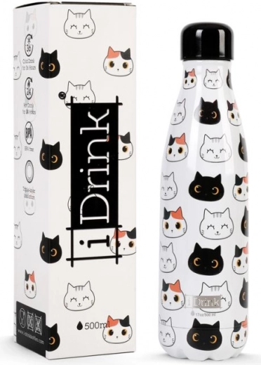Dank der isolierenden Konstruktion bleibt die Getränketemperatur länger erhalten. Der schlanke Körper (Höhe 26 cm, Durchmesser 7 cm) passt bequem in Getränkehalter und Rucksäcke. Die elegante Grafik mit Katzen unterstreicht deinen Stil.