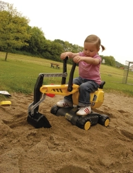 Kinder können sich mit der Maschine frei um die vertikale Achse drehen und Material in alle Richtungen aufnehmen und versetzen – wie auf einer echten Baustelle.