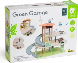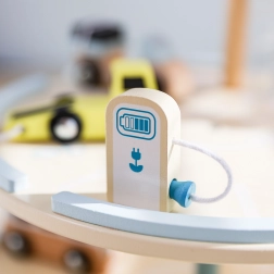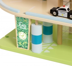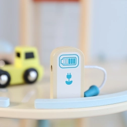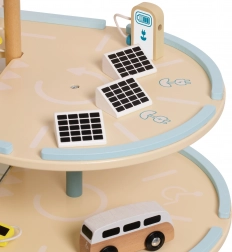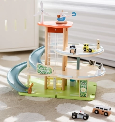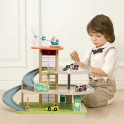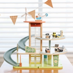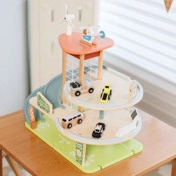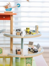 Dieser hölzerne dreistöckige Parkhaus ermöglicht es, Spielzeug dank des manuell bedienten Aufzugs zwischen den Etagen zu bewegen. Die spezielle kurvige Rampe erlaubt eine schnelle Abfahrt der Autos. Die Anlage ist zudem mit einer Ladestation ausgestattet. Das Set beinhaltet drei Autos und einen Helikopter, die stundenlangen Spielspaß und Fantasieentwicklung bieten.