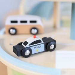 • 4 Holzfahrzeuge - Polizei, Abschleppwagen, Bus, Helikopter