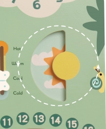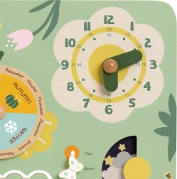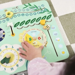Eleganter Holzkalendar für Kinder ist ein ideales Werkzeug für das Lernen von Zeit, Jahreszeiten und Wochentagen auf Englisch. Dank der drehbaren und verschiebbaren Elemente können Kinder leicht das aktuelle Datum, Wetter und den Wochentag einstellen.