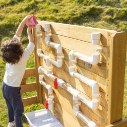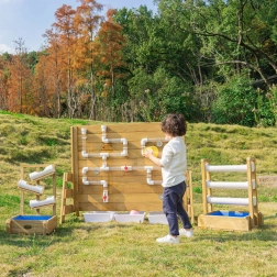 Diese zweiseitige Wand kombiniert sensorisches Wasserspiel mit STEM-Lernen. Eine Seite bietet bunte Wasserräder und Rinnen zur Beobachtung des Wasserflusses und von Ursache-Wirkungs-Zusammenhängen, die andere Seite bringt ein Netz aus transparenten und weißen Rohren mit Ventilen zur Steuerung der Durchflussmenge. Kinder trainieren Feinmotorik, logisches Denken und Zusammenarbeit.