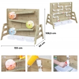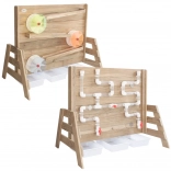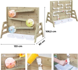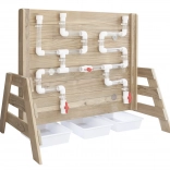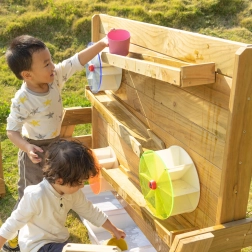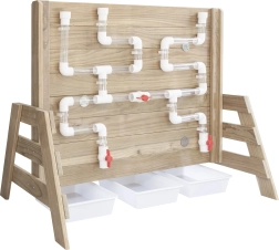 Die Holzkonstruktion aus imprägniertem Holz ist witterungsbeständig und mit einer ungiftigen Beschichtung behandelt. Perfekt als Ergänzung für Sandkästen und Außenspielplätze – bietet endlosen Spielspaß und zugleich eine sichere Umgebung für Experimente mit Wasserfluss und dem In-Bewegung-Setzen von Rädern.