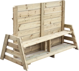 Die Konstruktion besteht aus imprägniertem Kiefernholz, das wetterbeständig ist und mit ungiftiger Beschichtung sicher behandelt wurde. Die Rückseite des Panels bietet eine praktische Sitzbank und ein unteres Ablageregal – ideal für eine kurze Pause zwischen den Spielphasen.