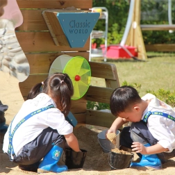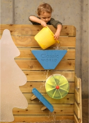 Zwei Trichter, transparente Kanäle und ein Mühlrad verwandeln Wasser oder Sand in ein faszinierendes Spektakel. Kinder beobachten den Fluss, experimentieren und lernen die Prinzipien von Schwerkraft und Strömung kennen.