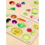 Jedes Teil stellt eine andere Gemüsesorte dar und trainiert das Erkennen von Formen, Farben sowie den Wortschatz.