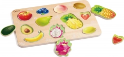 Jedes Teil passt in eine passende Aussparung, sodass Kinder das Prinzip des Sortierens und Zuordnens leicht verstehen, während sie die Namen und Farben der Obstsorten lernen.