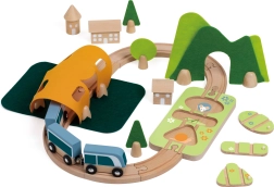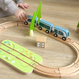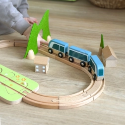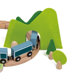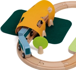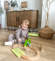 Die Teile lassen sich kreativ kombinieren – Holzbausteine können aufeinander gestapelt werden, um Häuschen entlang der Schienen zu bauen. Hochwertige Naturmaterialien (Holz mit FSC-Zertifizierung, Filz aus recyceltem P.E.T.) sind langlebig, angenehm in der Haptik und ressourcenschonend. Ideal für das selbstständige Spiel und das gemeinsame Entdecken.
