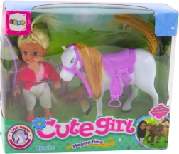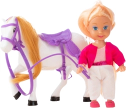 Lieferumfang: Mini-Puppe im Reitoutfit, weißes Pferd mit langer Mähne und Schweif, lila Sattel und Zaumzeug, Reitgerte.