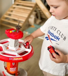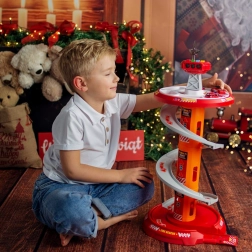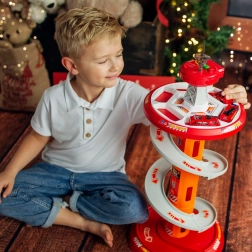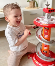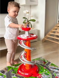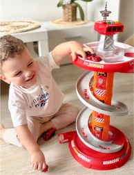 Der unterhaltsame spiralförmige Parkplatz für kleine Feuerwehrleute der Marke WOOPIE bietet eine mehrstöckige Strecke mit rascher Abfahrt, Licht- und Soundeffekten sowie 3 Feuerwehrautos. Kinder ab 3 Jahren genießen actionreiche Fahrten auf der kreisförmigen Rampe, Einsätze und Fahrten auf der beiliegenden Straßenmatte mit Verkehrszeichen.