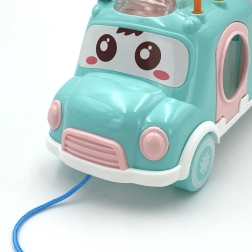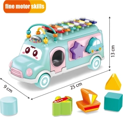 Das Musikauto hat viele Elemente zum Manipulieren und Entdecken. Das Kind kann den beigefügten Hammer verwenden, um auf dem bunten Xylophon, das sich auf dem Dach des Fahrzeugs befindet, zu spielen. An den Seiten des Autos gibt es Öffnungen in verschiedenen Formen, wobei bunte Bausteine enthalten sind, die in diese Öffnungen eingesetzt werden können. Dieses Spiel hilft dem Kind, Koordinationsfähigkeiten und das Erkennen von Farben und Formen zu entwickeln. Murmeln auf dem Dach, die das Kind verschieben kann, trainieren seine Geschicklichkeit und Konzentration.