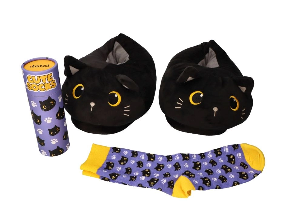 Gestickte gelbe Augen, Öhrchen und Schnurrhaare verleihen den Hausschuhen einen charakteristischen Look, der Kinder wie Erwachsene erfreut.