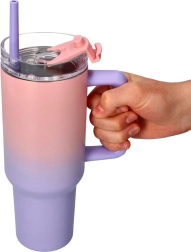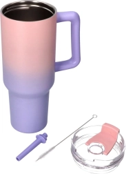 Entdecken Sie den Komfort eines großvolumigen Thermobechers, der modernes Aussehen mit praktischen Details vereint. Der pastellige Farbverlauf von Rosa zu Lila fällt sofort ins Auge, der transparente Deckel mit Öffnung für den Strohhalm und der bequeme Henkel erleichtern die tägliche Nutzung zu Hause und unterwegs.