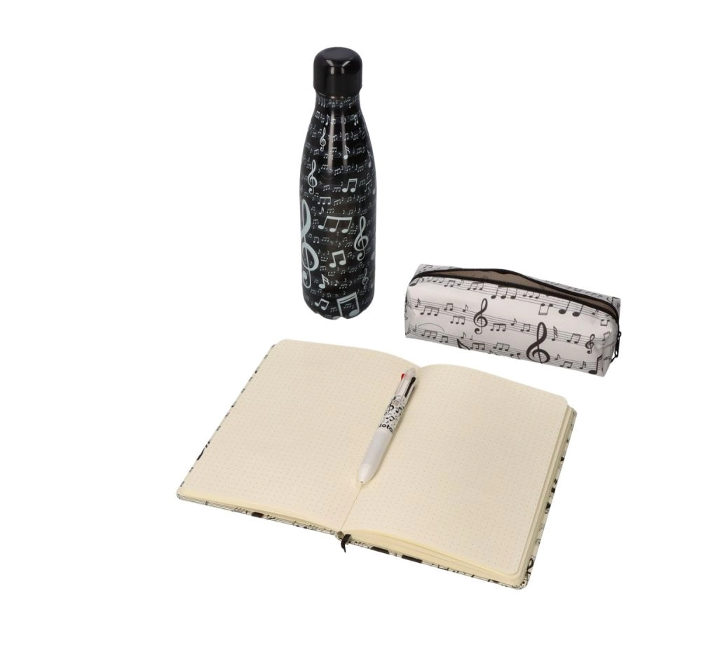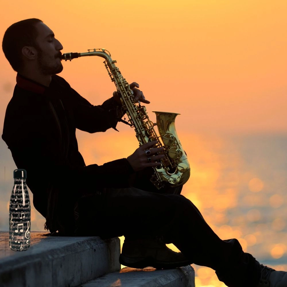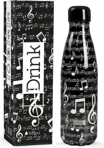 Diese schwarze Thermoflasche mit dem Musikmotiv „Music“ besticht durch eine schlichte, elegante Ästhetik mit 3D-Effekt. Dank der kompakten Abmessungen passt sie leicht in den Rucksack oder in den Flaschenhalter. Sie ist ideal für warme und kalte Getränke, die sie länger auf der gewünschten Temperatur hält.