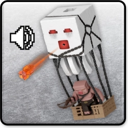 Erlebe das Minecraft-Filmabenteuer live. Der interaktive Ghast ist mit einer Taste auf der Oberseite ausgestattet, die Lichter, Soundeffekte aktiviert und ein oranges Projektil aus dem Maul abfeuert. Dank der Ketten und des hängenden „Käfigs“ kannst du Szenen nachspielen, in denen Piglins Ghasts für Angriffe einsetzen.