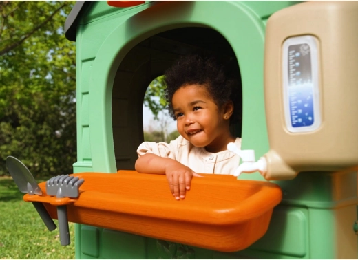 Ein integrierter Blumenkasten, Wasserhahn und Gartenwerkzeuge motivieren zum Säen, Gießen und Beobachten des Pflanzenwachstums. Ein praktisches Vogelhäuschen ist ebenfalls dabei.