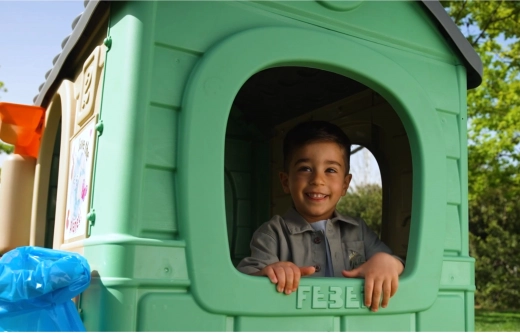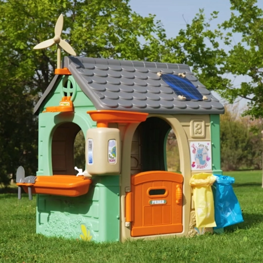 Das FEber Recycle Eco Häuschen bringt realistische ökologische Spiele in Garten und auf die Terrasse. Enthalten sind Recyclingbehälter (gelb und blau), ein Blumenkasten für die ersten Gartenversuche, Gartenwerkzeuge, ein Vogelhäuschen sowie dekorative Elemente zur Förderung der Umweltbildung. Dank der Windturbine und der Imitation eines Solarpanels verstehen Kinder spielerisch die Prinzipien nachhaltiger Energie.