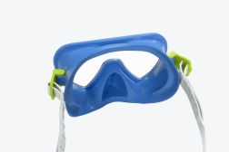 Die blaue Tauchmaske ist mit UV-schützenden Gläsern und einem verstellbaren Silikonband ausgestattet, das Komfort und Sicherheit unter Wasser gewährleistet.