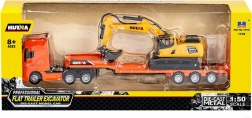 Das Set enthält einen Sattelzug mit Tiefladeranhänger und Bagger, was mehr Spielmöglichkeiten und eine realistische Simulation des Transports schwerer Maschinen ermöglicht. Der Lastwagen hat bewegliche Teile und die Auffahrrampe kann zum Be- und Entladen des Fahrzeugs auf eine Weise abgesenkt werden, die der tatsächlichen Transportarbeit entspricht.