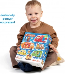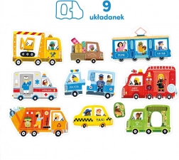 Im Set findet ihr verschiedene bekannte Fahrzeuge – Krankenwagen, Taxi, Müllwagen, Feuerwehr, Abschleppwagen, Straßenbahn und weitere. Einzigartiges Element: Die Teile mit Figuren können zwischen den einzelnen Puzzles beliebig ausgetauscht werden, um neue Geschichten und Situationen zu erschaffen.