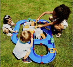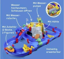 AquaPlay MountainLake ist eine große, durchdachte Wasserbahn für Kinder ab 3 Jahren, die kreatives Spiel mit dem Entdecken physikalischer Phänomene verbindet. Kinder können die Bergseen über eine Turmklappe füllen, durch den Höhentunnel fahren und den Wasserfall hinabsausen. Mit der Kurbel und ihren breiten Schaufeln lassen sich leicht Wasserströmungen erzeugen, die die Boote durch die Kanäle und über die Schleusen leiten.