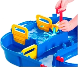 Die Wasserbahn AquaPlay Megabrücke bietet endlose Möglichkeiten zum Spielen und Entdecken für Kinder und Eltern. Dieses umfassende Spielset umfasst 49 Teile, darunter ein Containerschiff, ein amphibisches Lastauto und zwei Figuren.